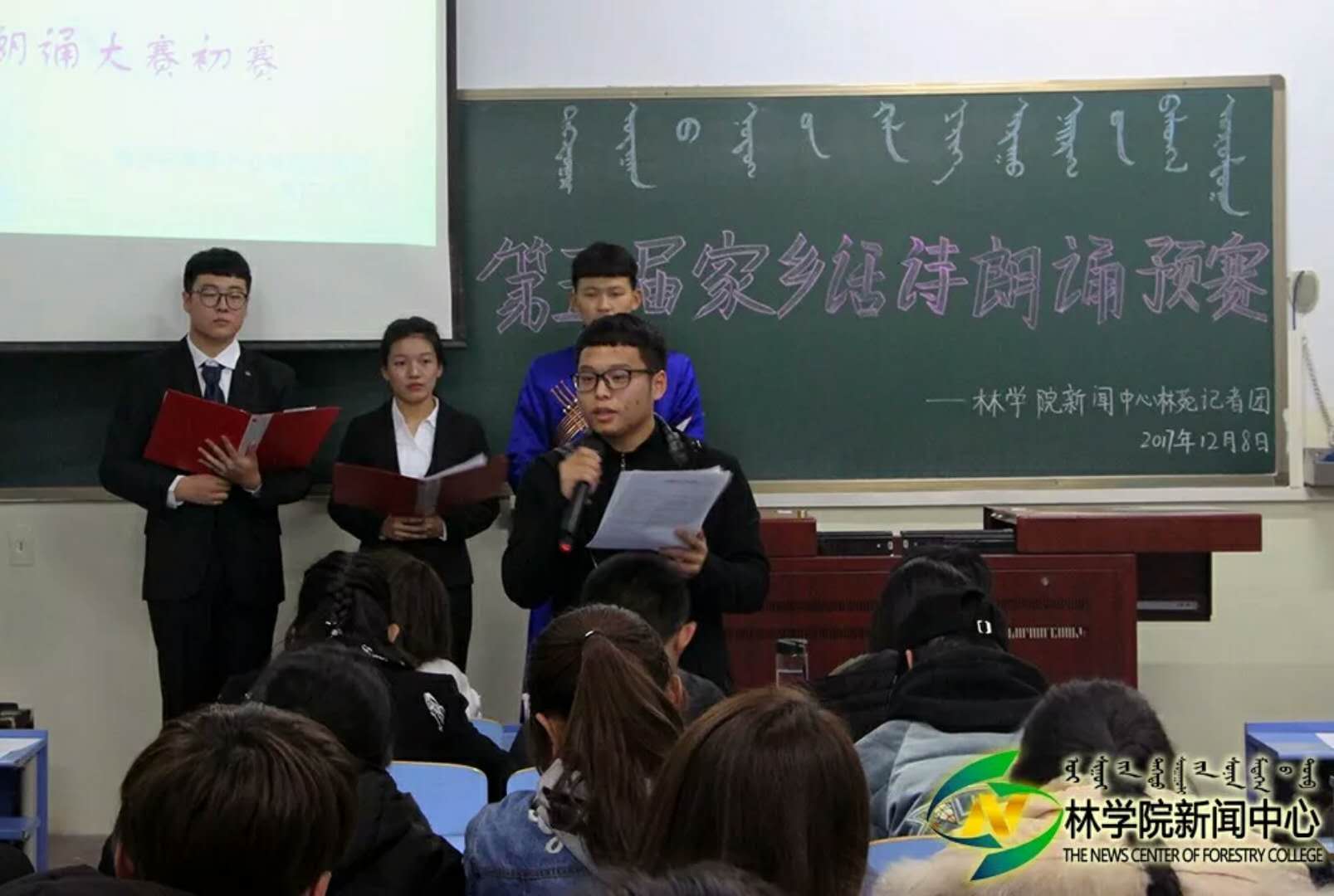 为了传承方言文化,传递对故乡的思念。12月8日晚7:00,我院新闻中心记者团于东主114教室举办第五届“乡情乡音、诗意内林”家乡话朗诵预赛。此次大赛的评委有林苑记者团团长任重,第四届家乡话诗朗诵大赛一等奖获得者李瑾,二等奖获得者杨子湘,三等奖获得者索朗次培,最佳台风奖获得者萨日盖,最佳语言获得者岳文、白向东和优秀代表张亚伦。