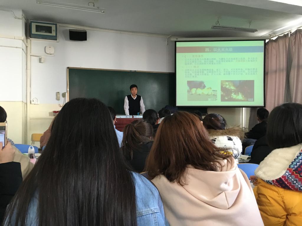 2017年12月18日下午,消防工程教研室组织教研室全体教师参加了《森林消防》课程镶嵌式教学听课活动,老师们一起聆听了由内蒙古林业厅防火办李树森主任为2016级林学专业学生讲授的《森林消防》课程灭火章节的内容,bt365官方网站院长铁牛也一起参加了此次活动。