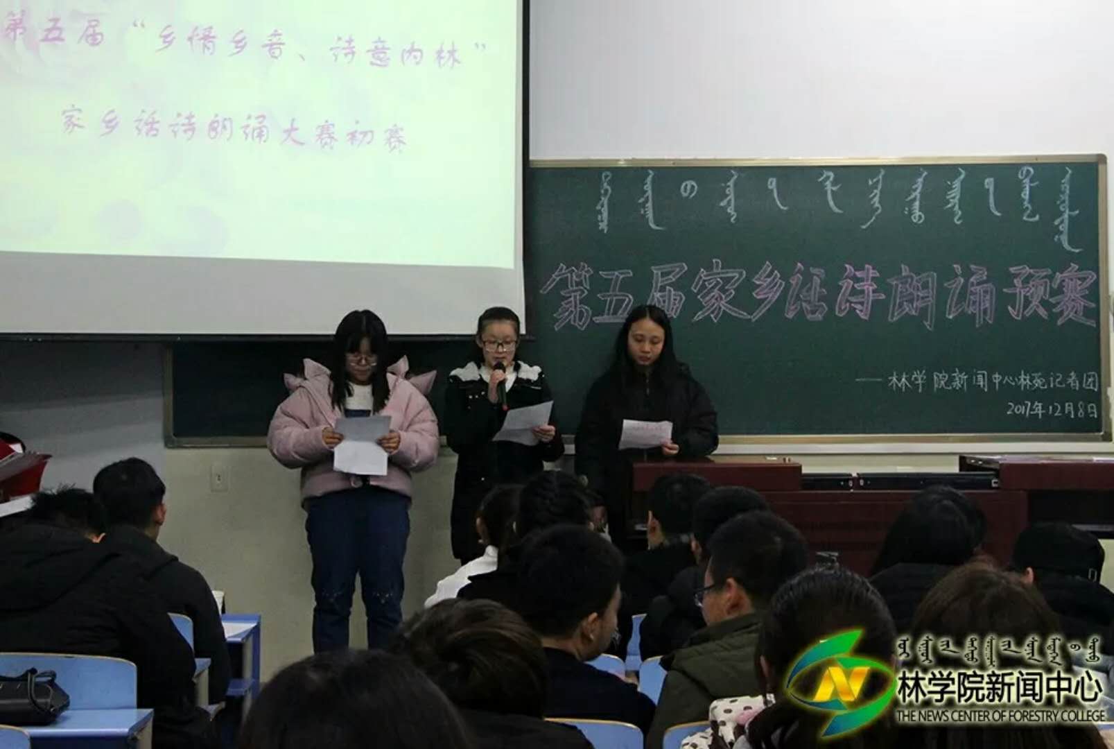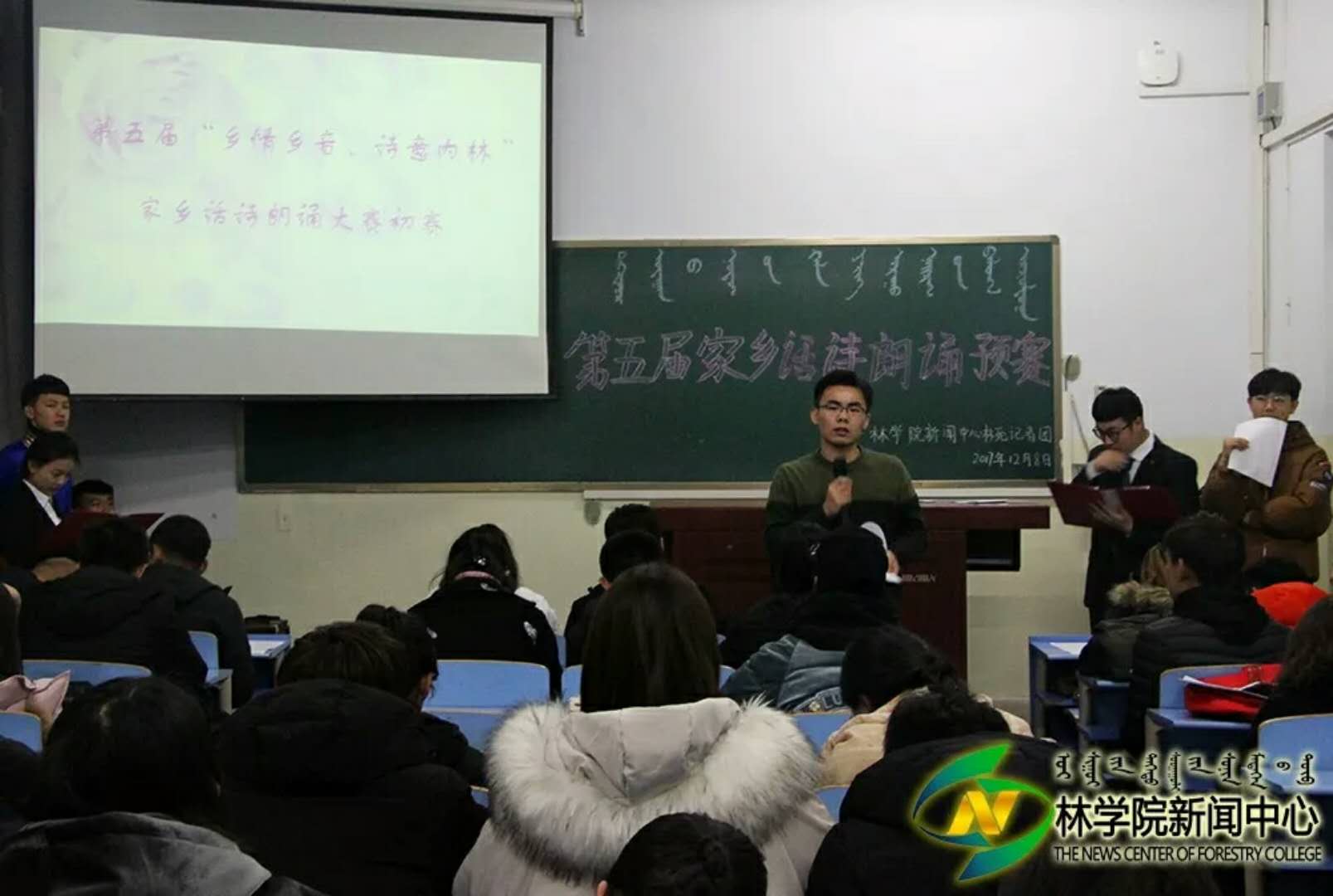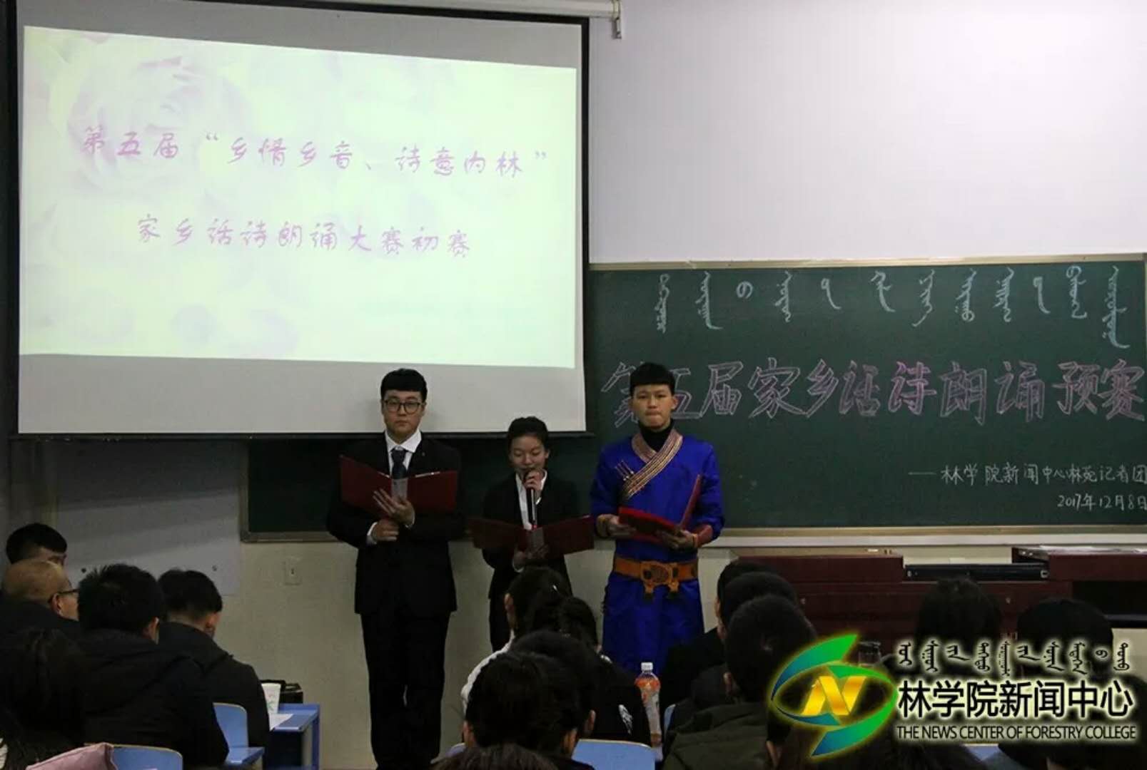 为了传承方言文化,传递对故乡的思念。12月8日晚7:00,我院新闻中心记者团于东主114教室举办第五届“乡情乡音、诗意内林”家乡话朗诵预赛。此次大赛的评委有林苑记者团团长任重,第四届家乡话诗朗诵大赛一等奖获得者李瑾,二等奖获得者杨子湘,三等奖获得者索朗次培,最佳台风奖获得者萨日盖,最佳语言获得者岳文、白向东和优秀代表张亚伦。
